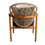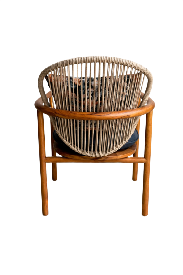 A relaxed outdoor lounge chair with a solid teak wood frame, oiled for durability, featuring an aluminum backrest wrapped in synthetic rope detailing. Complete with a removable upholstered seat cushion, matching back cushion, subtle stainless steel detailing, and protective glides for outdoor use.