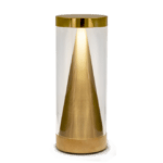 Designed with sustainability in mind, the lamp is precision-milled from solid brass or aluminium alloy and mechanically joined via a clear acrylic tube to an internal injection-moulded form.