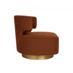 This sculptural lounge chair features a fully upholstered shell wrapped in a bold geometric fabric. Set on a sleek stainless steel base with electroplated skirting.