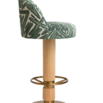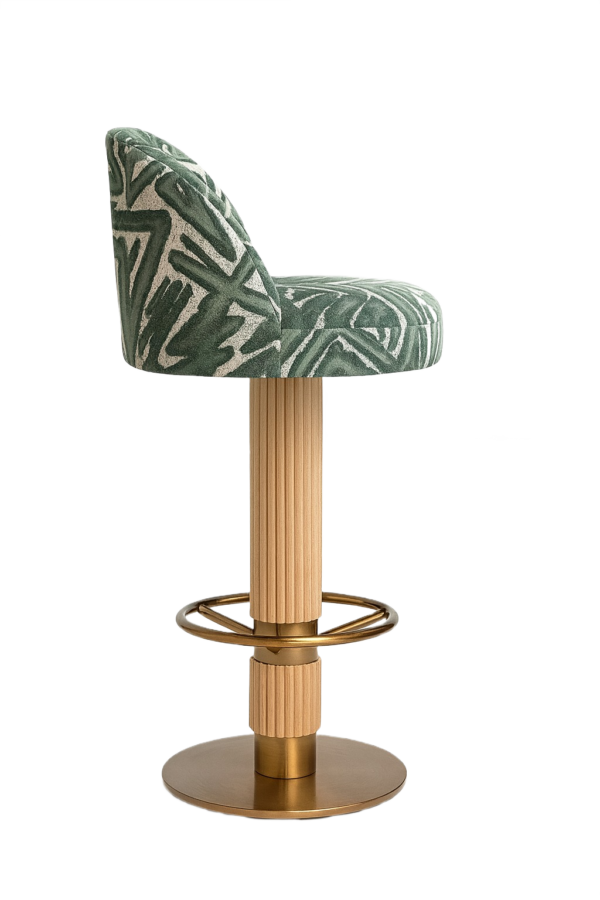 The seat and back are fully upholstered, supported by a solid red oak column base in a stained finish. The footrest and base plate are crafted in stainless steel with an electroplated coating.