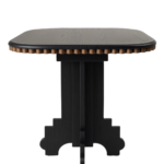 A 40 mm thick MDF tabletop with red oak veneer, stained in black and finished with a soft half-bullnose edge and gently rounded corners. A ribbed stainless steel electroplated detail sits beneath the top, adding a subtle architectural accent. The base is crafted from solid red oak wood in an open-grain, no-gloss black stain, and the table is completed with discreet glides for everyday ease.