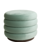 A fully upholstered pouf with layered, rounded cushioning and a solid base.
