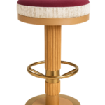 The seat is upholstered, supported by a solid red oak column base in a stained finish. The base plate and footrest are crafted in stainless steel with an electroplated finish.