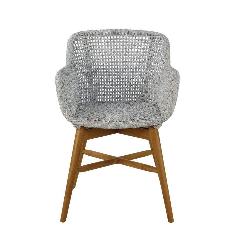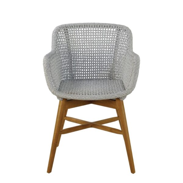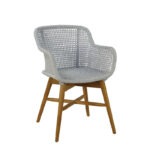 W 590 x D 650 x H 840 – SH 440 MM / Net Weight: 6 Kg / Wooden Teak Legs / Natural Wood Stain / Woven Synthetic Cord Dia 4.8 White Shell