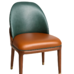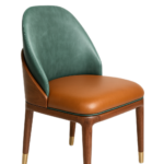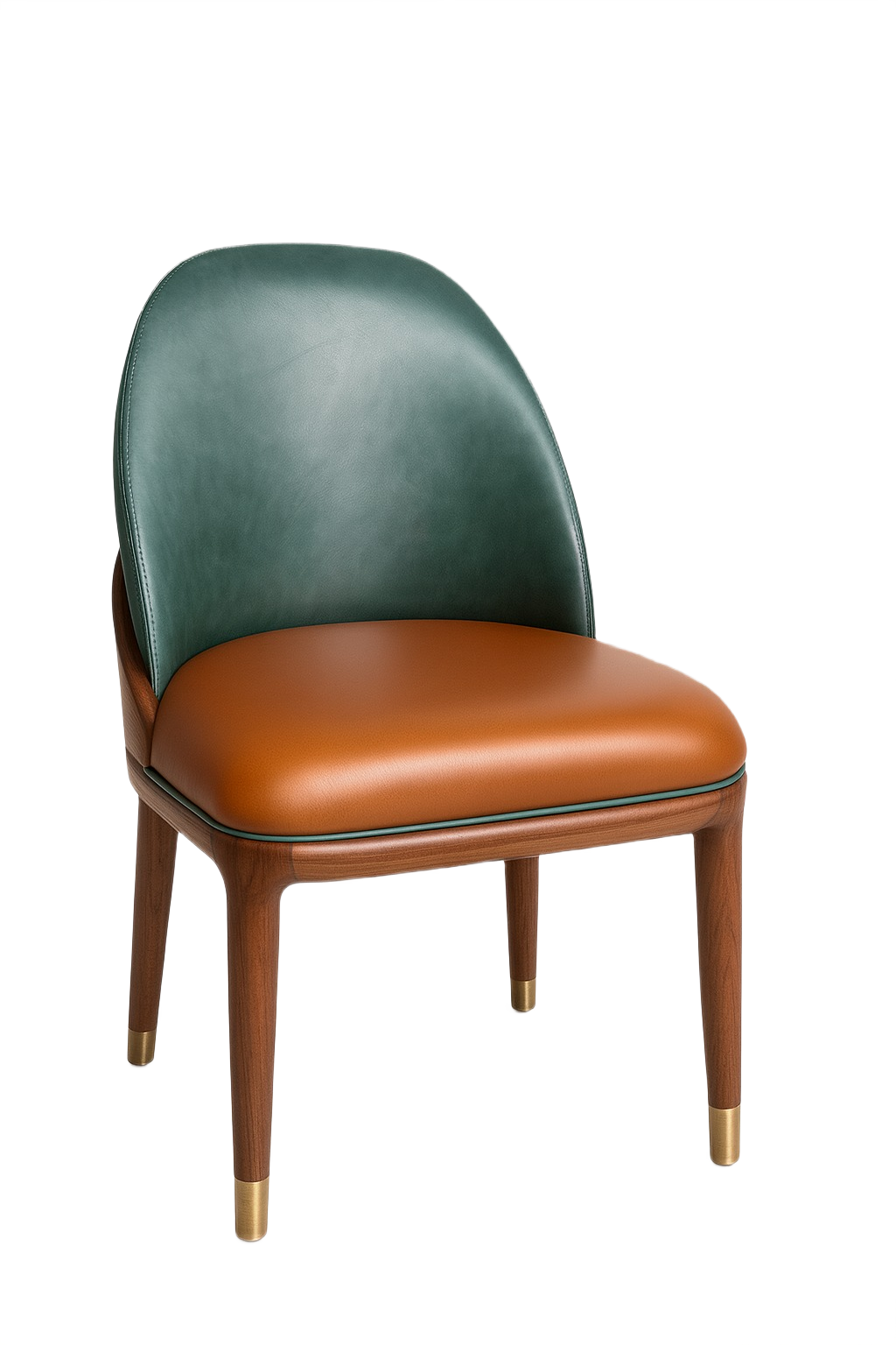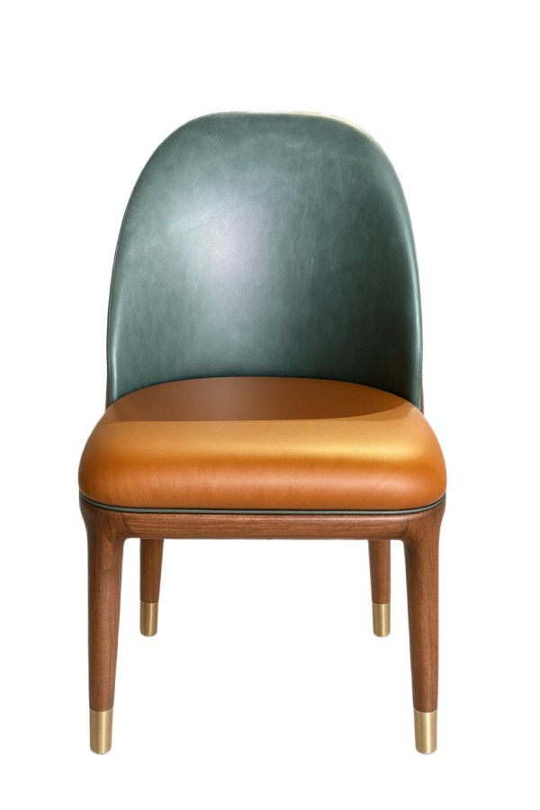The seat and back are upholstered in real leather. The legs are crafted from stained solid walnut wood, finished with electroplated stainless steel leg caps and a matte brass back ring detail. Completed with glides.