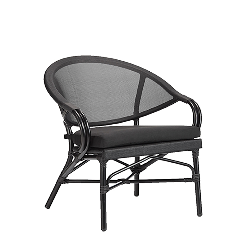 W 760 x D 720 x H 740 – SH 450 MM / Powder Coated Aluminum Frame Black / Seat and Back in Textylene or Synthetic Rattan Black / Back Cushion Included / Fabric Black Cost Included