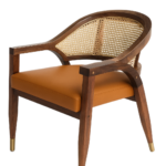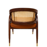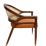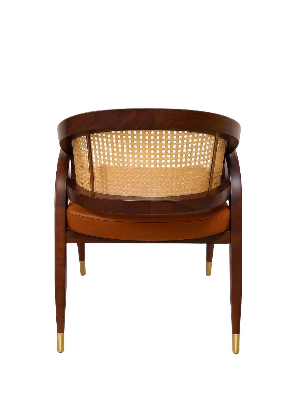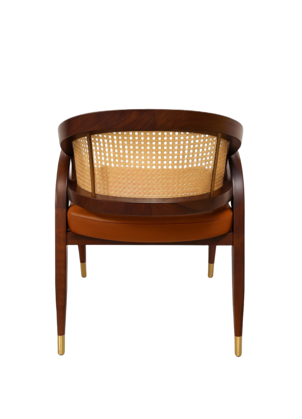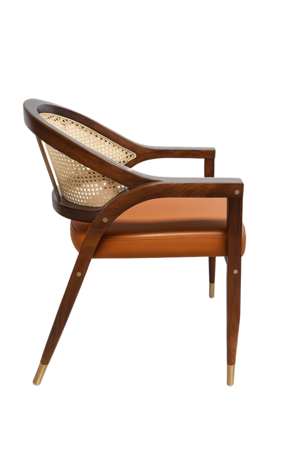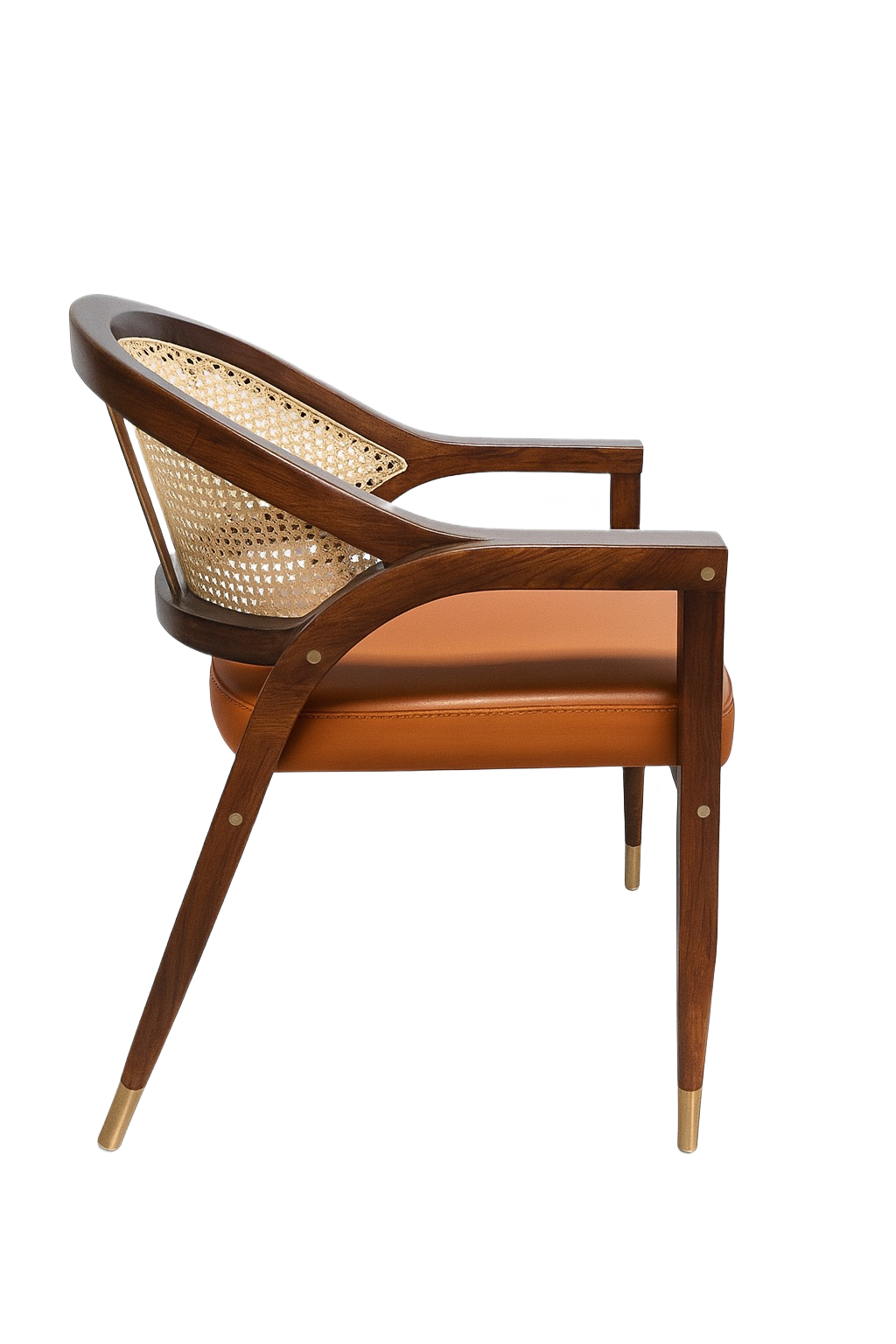 The seat is upholstered in real leather, while the back features synthetic rattan. The frame is crafted from stained solid walnut wood, complemented by stainless steel electroplated matte brass leg caps and stud detailing. Finished with glides.