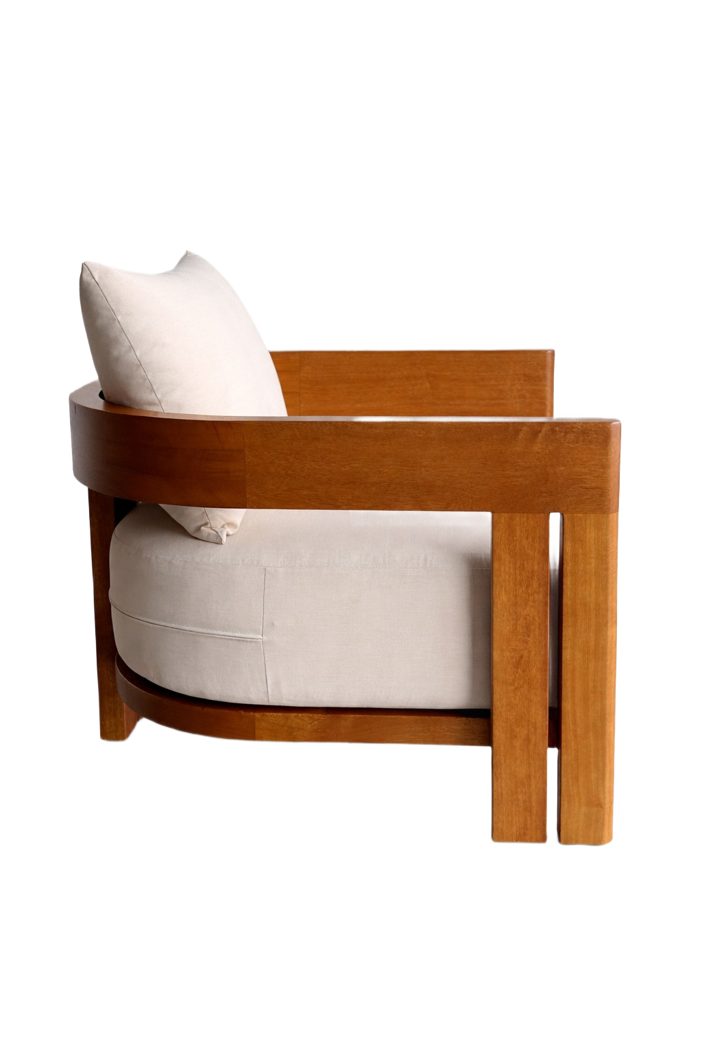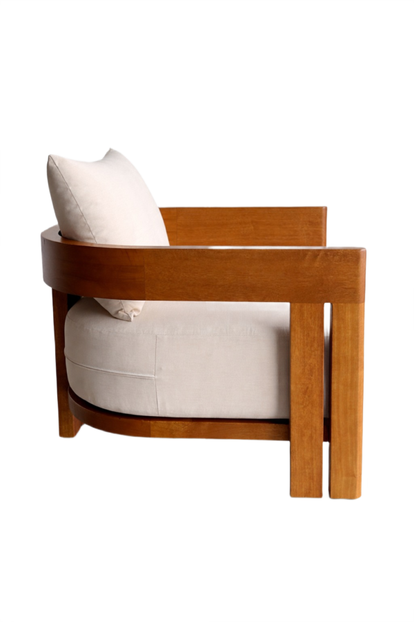 Outdoor-ready lounge chair featuring a solid iroko wood frame with an oiled finish, a removable seat cushion, and one loose decorative cushion for added comfort.